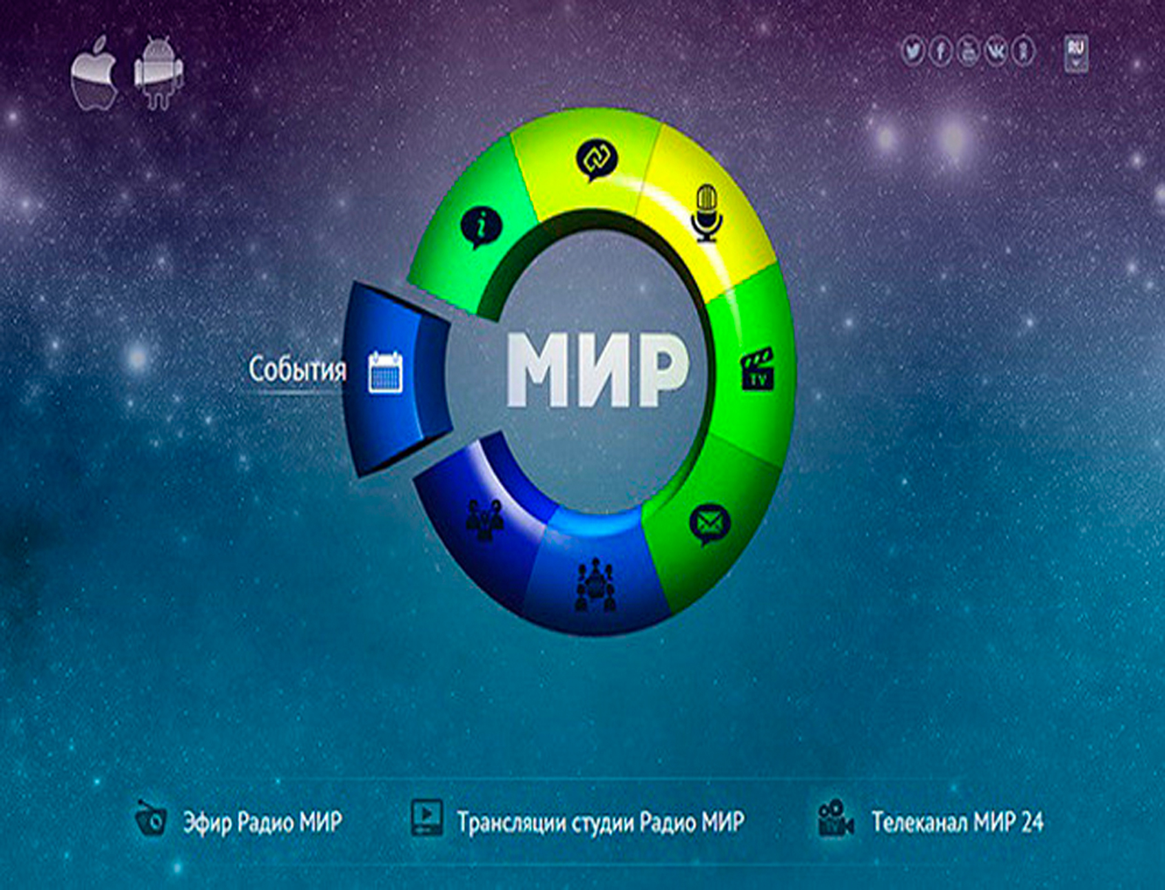 Мир – это международная телерадиокомпания (МТРК), которая была основана соглашением глав государств-участников СНГ 9 октября 1992 г. В состав МТРК «Мир» входят телеканалы «Мир», «Мир 24», «Мир HD», радиостанция «Мир», а также информационно-аналитический портал «MIR24.TV». Головной офис находится в Смоленске; филиалы и представительства – в 9 странах СНГ. Вещание осуществляется на русском языке. Председателем МТРК «Мир» и руководителем одноименного канала является Радик Батыршин. С 2017 г. слоганом МТРК «Мир» является фраза: «Телеканал многих столиц».